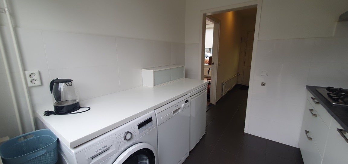 Entree: hal met trap-/meterkast en toilet, biedt toegang tot de keuken en woonkamer. Tuingerichte woonkamer, voorzien van vloerverwarming met laminaatvloer en afzonderlijke warm & koud airco, 2022. Aan de voorzijde voorzien van rolgordijnen; aan de achterzijde openslaande deuren met (inbetween) gordijnen. De keuken is voorzien van diverse apparatuur o.a. een afzuigkap, koelkast, vaatwasmachine en wasmachine.