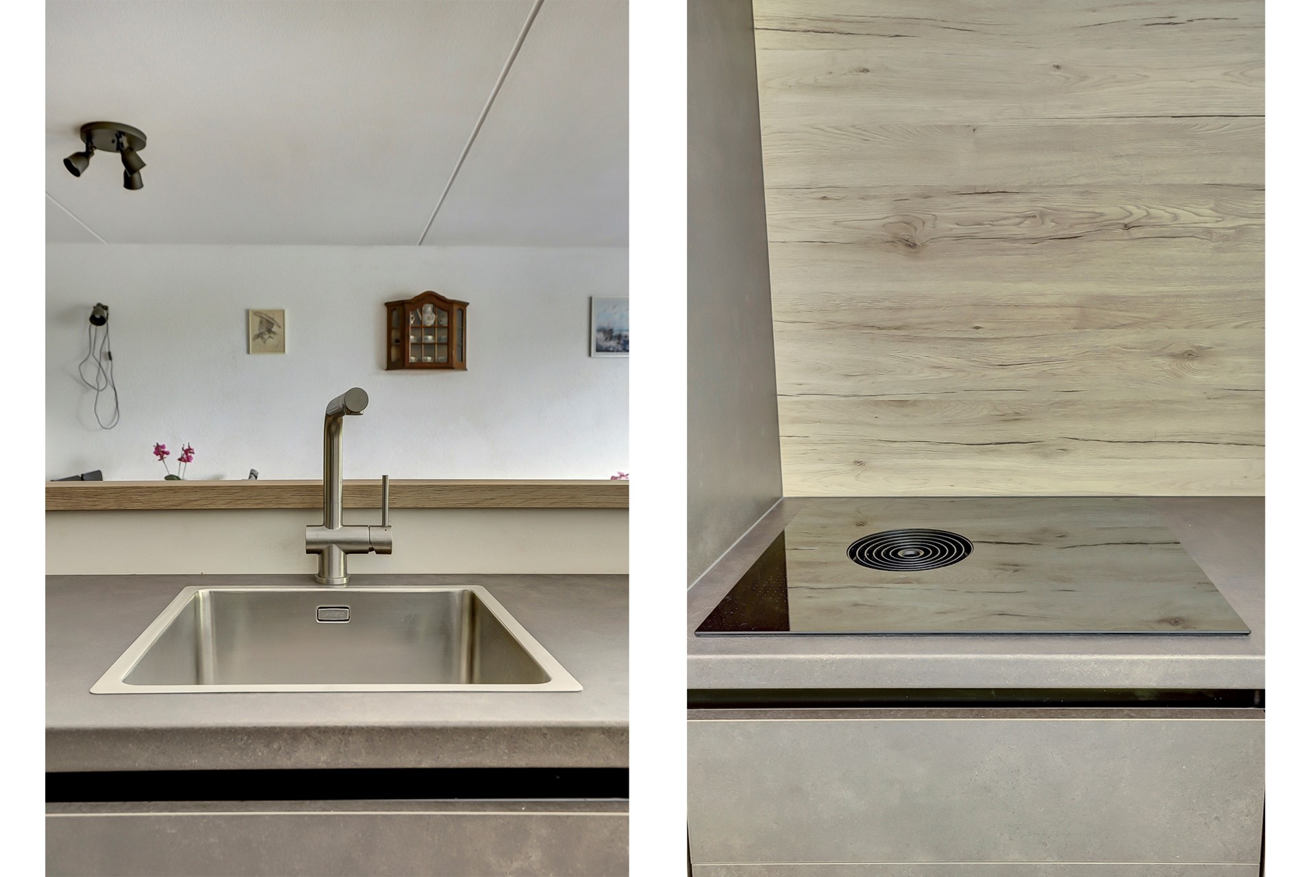 Moderne open keuken met diverse inbouwapparatuur zoals inductiekookplaat, oven en koel/vries combinatie.
