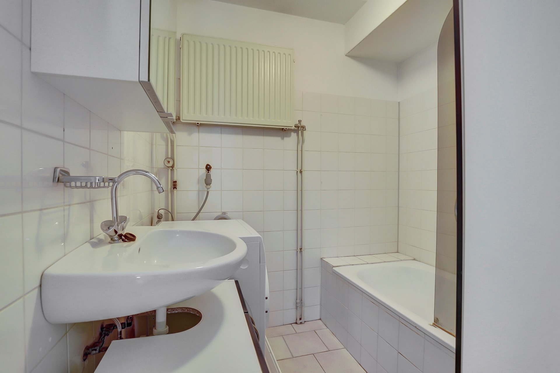 Nette badkamer met ligbad/ douche, wastafel en wasmachineaansluiting
