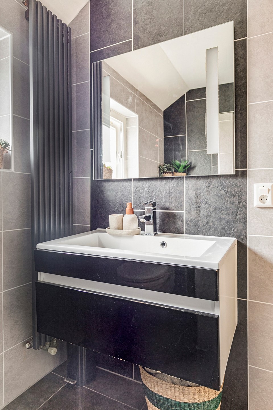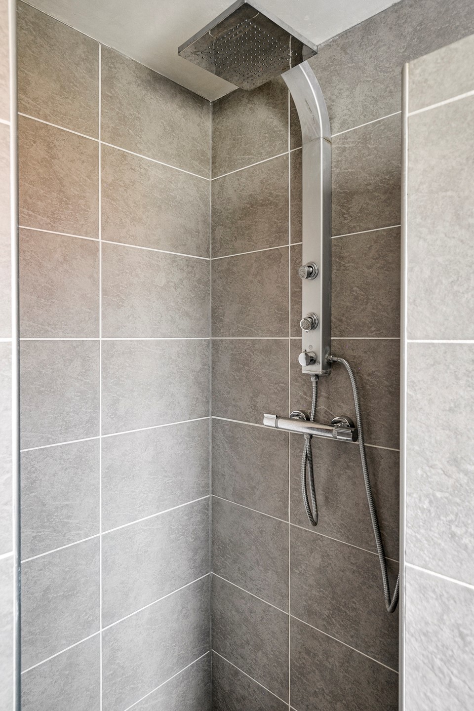 Overloop, 2 grote slaapkamers aan de voor- en achterzijde met airconditioning, walk in closet (ook te gebruiken als slaapkamer), moderne badkamer met inloopdouche, wastafelmeubel en vrijhangend toilet.