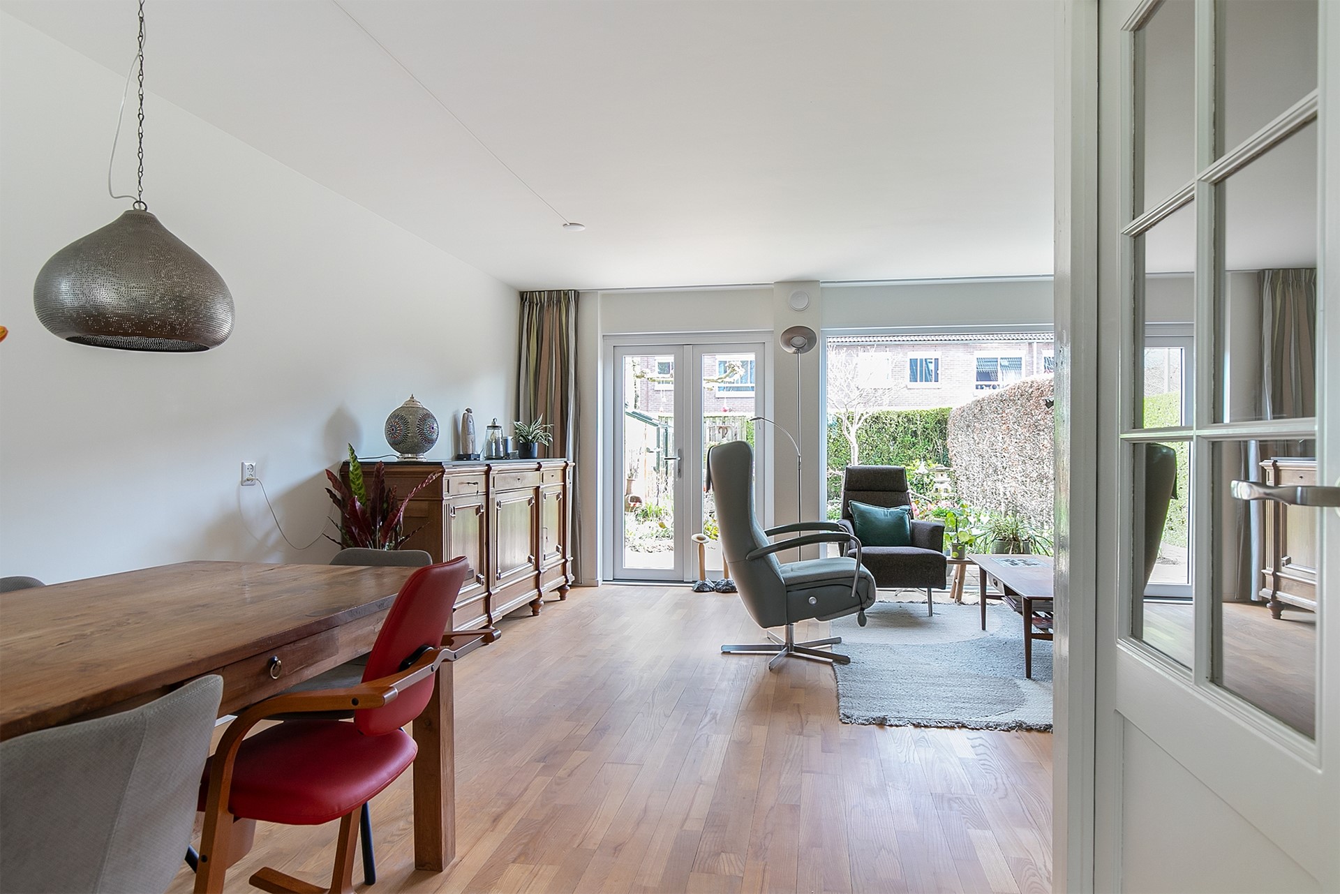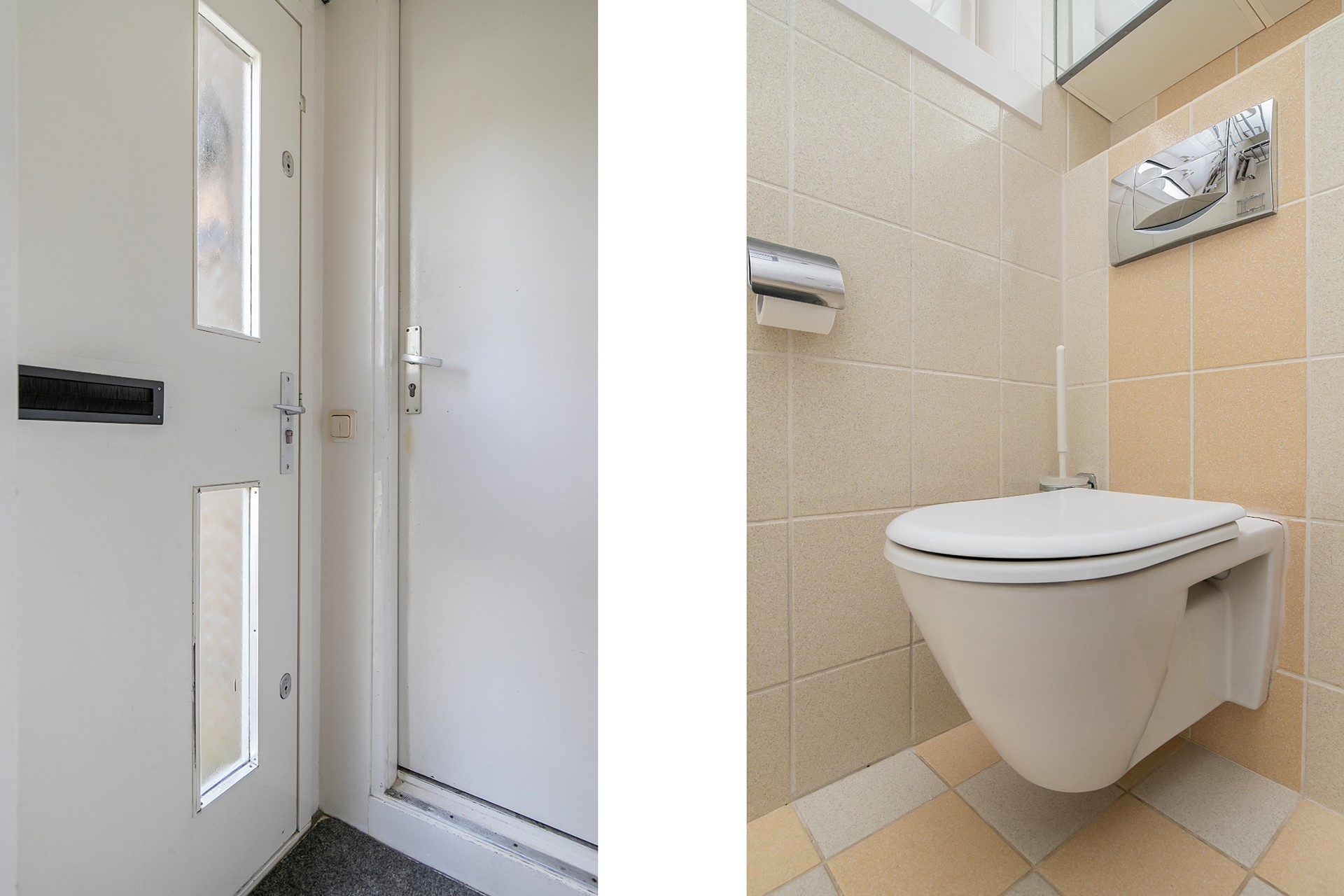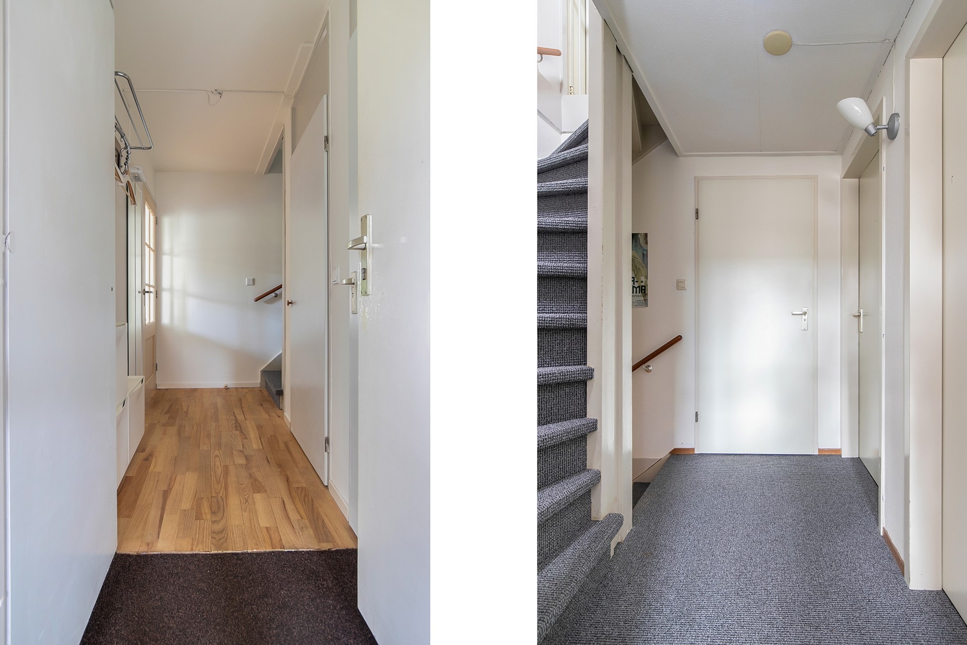 Entree/ hal, deur naar de berging, modern vrijhangend toilet, meterkast en trapkast. Aan de voorzijde bevindt zich de functionele keuken met oven, inductiekookplaat, afzuigkap, vaatwasmachine en koelkast, royale woonkamer met lamelparket vloer, veel lichtinval vanwege het grote raam en de openslaande deuren naar de zonnige tuin.