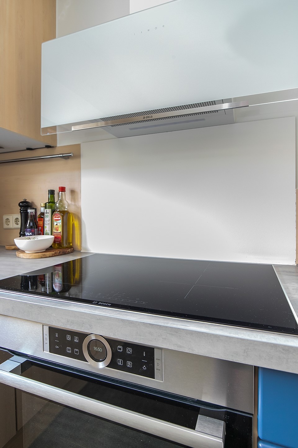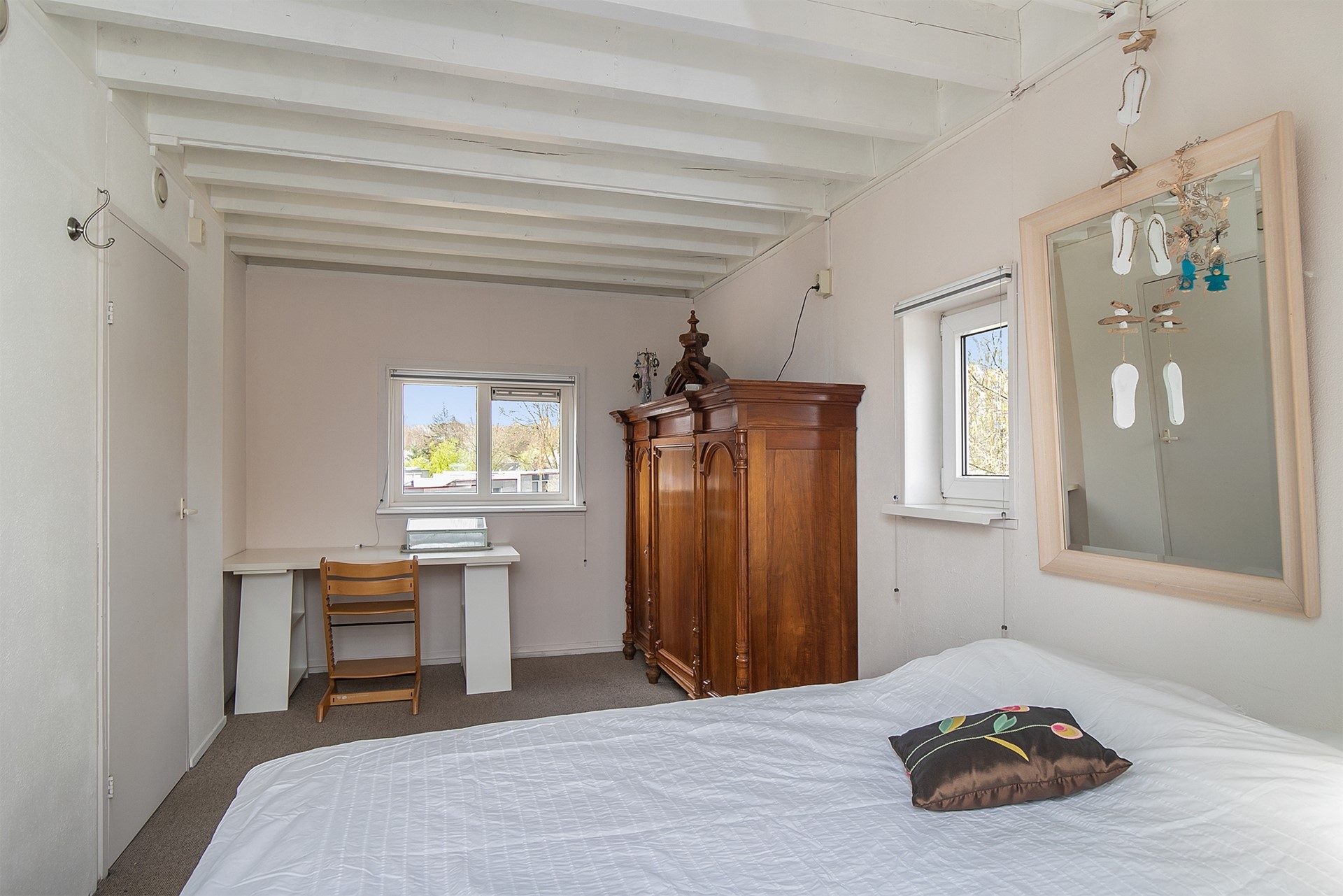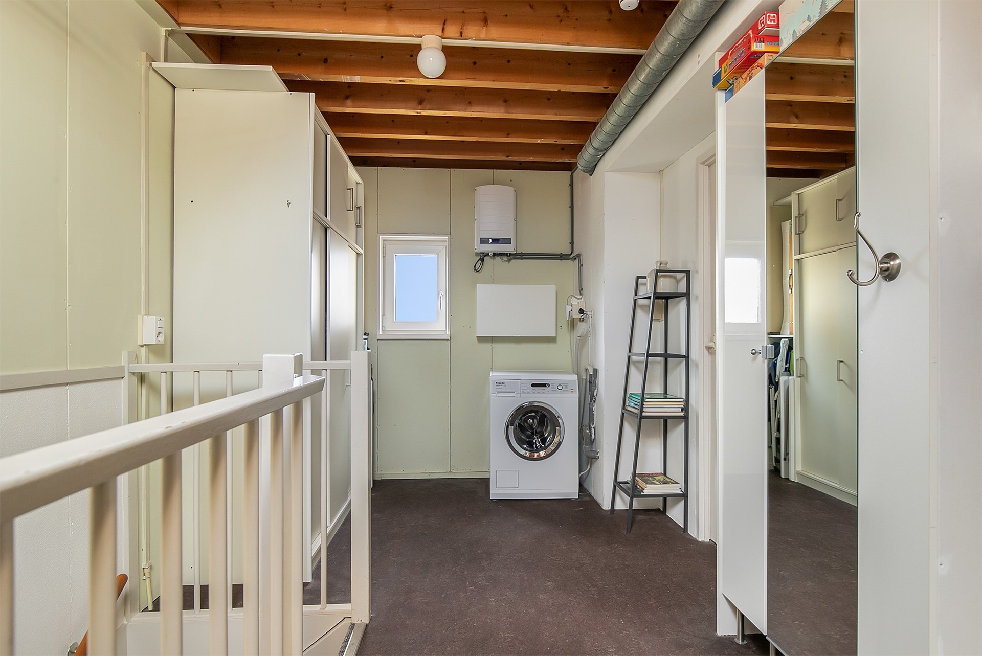 Overloop met opstelling Heteluchtverwarming en geiser, wasmachineaansluiting en omvormer zonnepanelen. Grote slaapkamer met dakraam en kopgevelraam. Ook hier valt de hoeveelheid aan licht op in de woning.